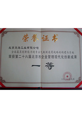 天海工业一直秉承“诚信、敬业、学习、创新,志在一流”的企业精神,以安全可靠的产品和优质的服务,树立了良好的企业形象,先后荣获中国百强企业、北京市十佳外商投资企业、北京市高新技术企业,中国金属压力容器制造行业排头兵企业和全国“五一”劳动奖状、“北京市专精特新小巨人企业”、“国家级专精特新小巨人企业”等荣誉称号。